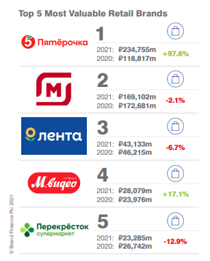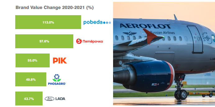 Самыми быстрорастущими участниками Brand Finance Russia 50 2021 оказалисьавиакомпания «Победа» (+113%), «Пятерочка» (+98%), девелопер «Пик» (+55%),«Фосагро» (+50%) и Lada (+44%).