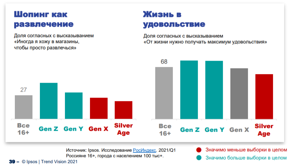 Люди хотят больше вовлечения и веселья от походов в офлайн-магазины.Четверть опрошенных (27%) иногда ходят в магазины только ради развлечения. Чащевсего так отвечали «зумеры». Это объясняет следующую тенденцию — от традиционноофлановых ритейлеров клиенты ждут перекалибровки своего физического опытапокупок в сторону более эмоциональной и вовлекающей реализации обещания брендаи его ценностей.