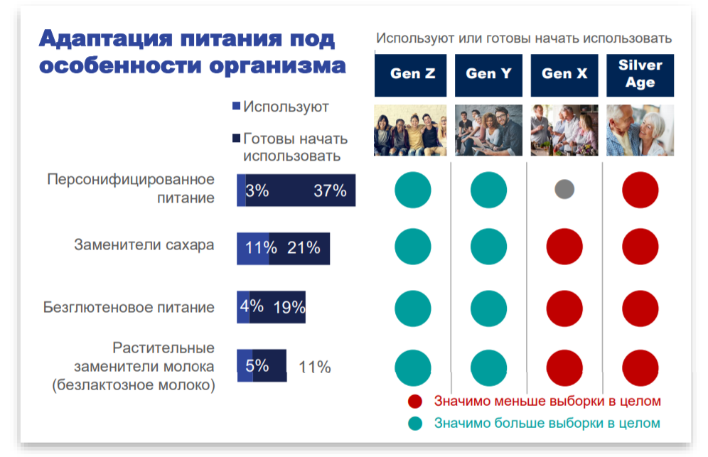 Потребителям интересно узнать, какое питание им подходит, и, еще больше –какое не подходит. В авангарде – Поколения Z и Y. Как отмечают исследователи, оперсонифицированном питании заговорили не давно, однако к сегодняшнему днюготовность начать его использовать уже вдвое выше, чем у заменителей сахара ибезглютенового питания.