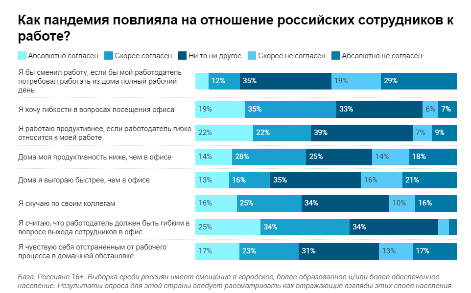 Главный тренд, который удалось выявить в ходе опроса, — россияне хотятгибкости в вопросах посещения офиса после пандемии. Этот вариант выбрали 54%респондентов, и только 13% — не согласились с ним. Опять же, гибкого отношенияруководителей к работе из дома ждут 59% опрошенных россиян.