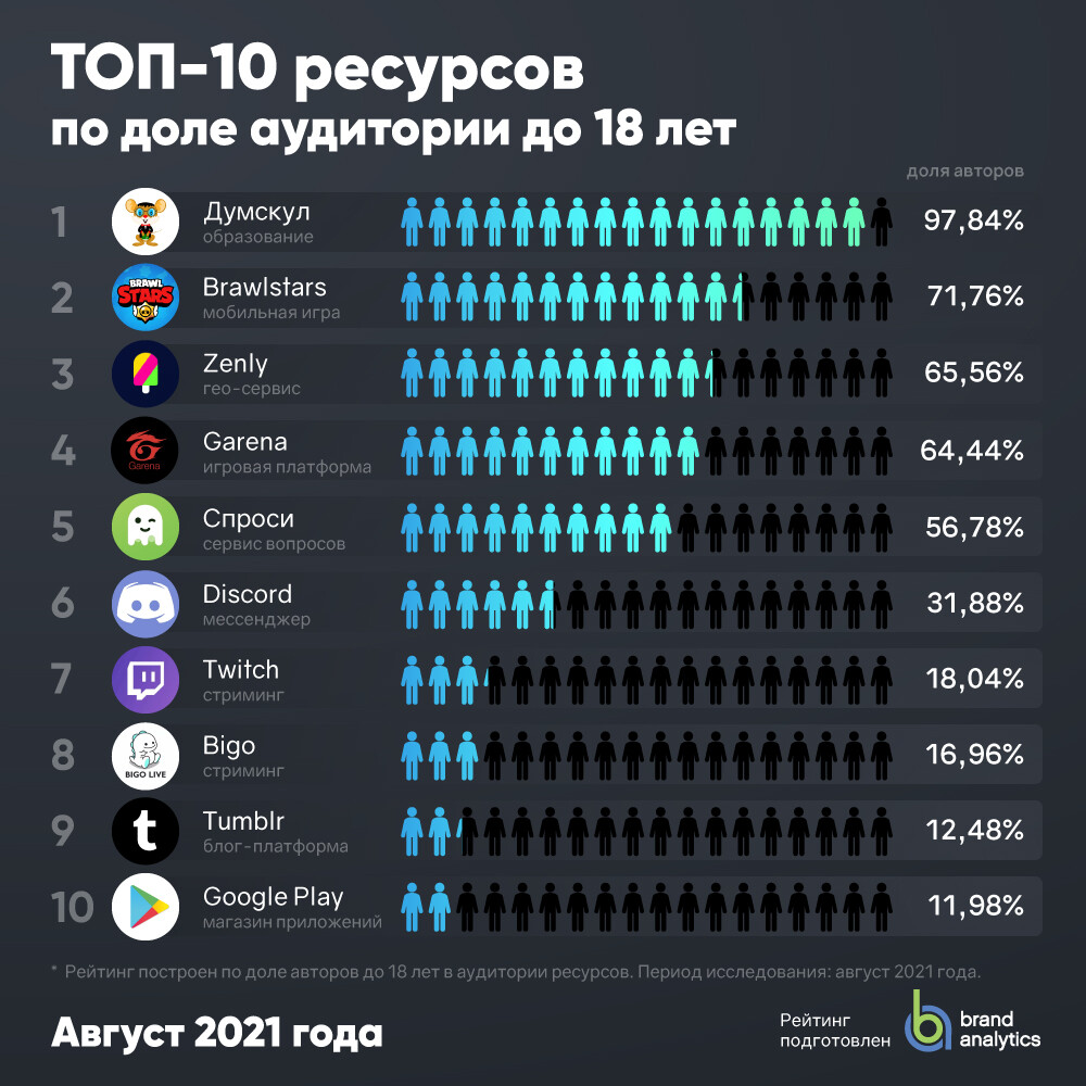 Самым популярным ресурсом у детей и подростков до 18 лет стал сервис частныхобъявлений «Юла», говорится в исследованииBrand Analytics. Рейтинг составлен по цитированию — числуссылок на ресурс, опубликованных пользователями соцмедиа до 18 лет в августе2021 г.