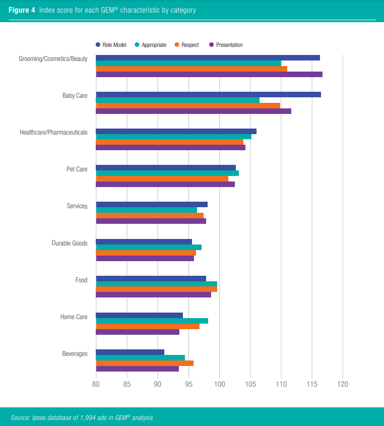 Согласно результатам, рекламу с самым высоким уровнем GEM запускают в такихкатегориях, как: «Уход за собой/Косметика», «Уход за ребенком»,«Здравоохранение/Фармацевтика». Эти же объявления показали более высокиерезультаты по таким критериям, как уважение и образец для подражания. Это можетбыть связано с тем фактом, что их продукция и реклама изначально ориентированына женщин и, следовательно, в большей степени соответствуют тому, как женщиныхотят видеть себя, полагают аналитики.