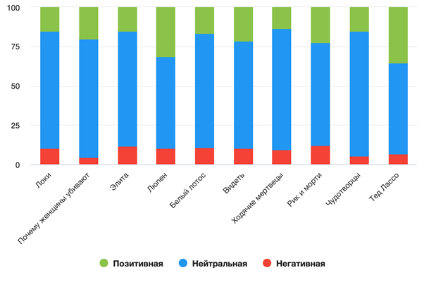 Больше всего позитивных отзывов собрали сериалы «Тед Лассо» и «Люпен», адоля негативных отзывов у самых популярных иностранных сериалов лета оказаласьпримерно одинаковой. Меньше других критиковали сериалы «Почему женщины убивают»и «Чудотворцы».