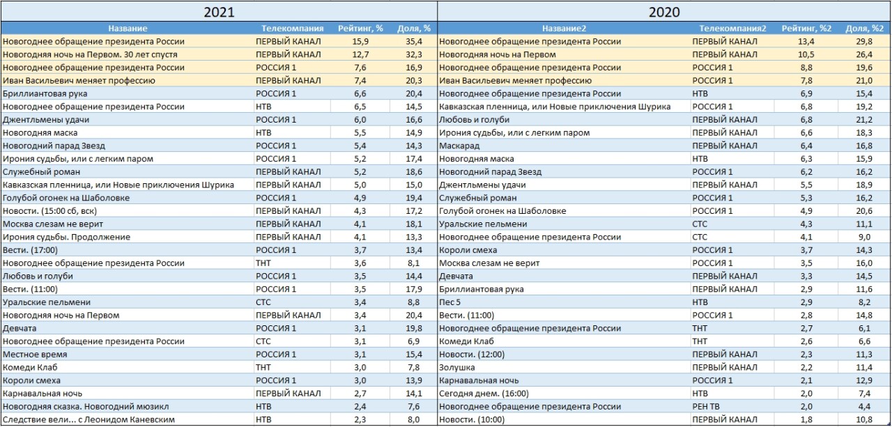 В целом, как следует из подсчетов Mediascope, список новогодних телепрограммзаметным образом не меняется, а топ-4 2021 г. полностью совпадает срейтингом 2020 г.