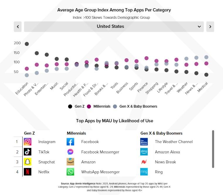 Перелома не случилось — зумеры остаются поклонниками соцмедиа иразвлечений, поэтому перевес остается на стороне Instagram, Snapchat,TikTok и Netflix. Миллениалы чаще скачивают Facebook, WhatsApp и Amazon, а людистарше 45 лет — приложения о погоде (The Weather Channel), голосовых помощников(Amazon Alexa) и новостные приложения (News Break).