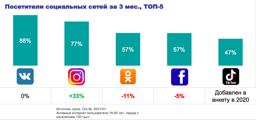 - Instagram вырос на 33% за последние три года. TikTok также набираетпопулярность: каждый второй опрошенный пользуется этой соцсетью хотя бы раз втри месяца.