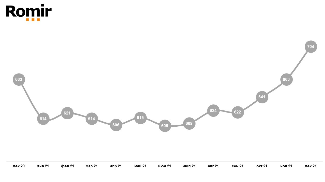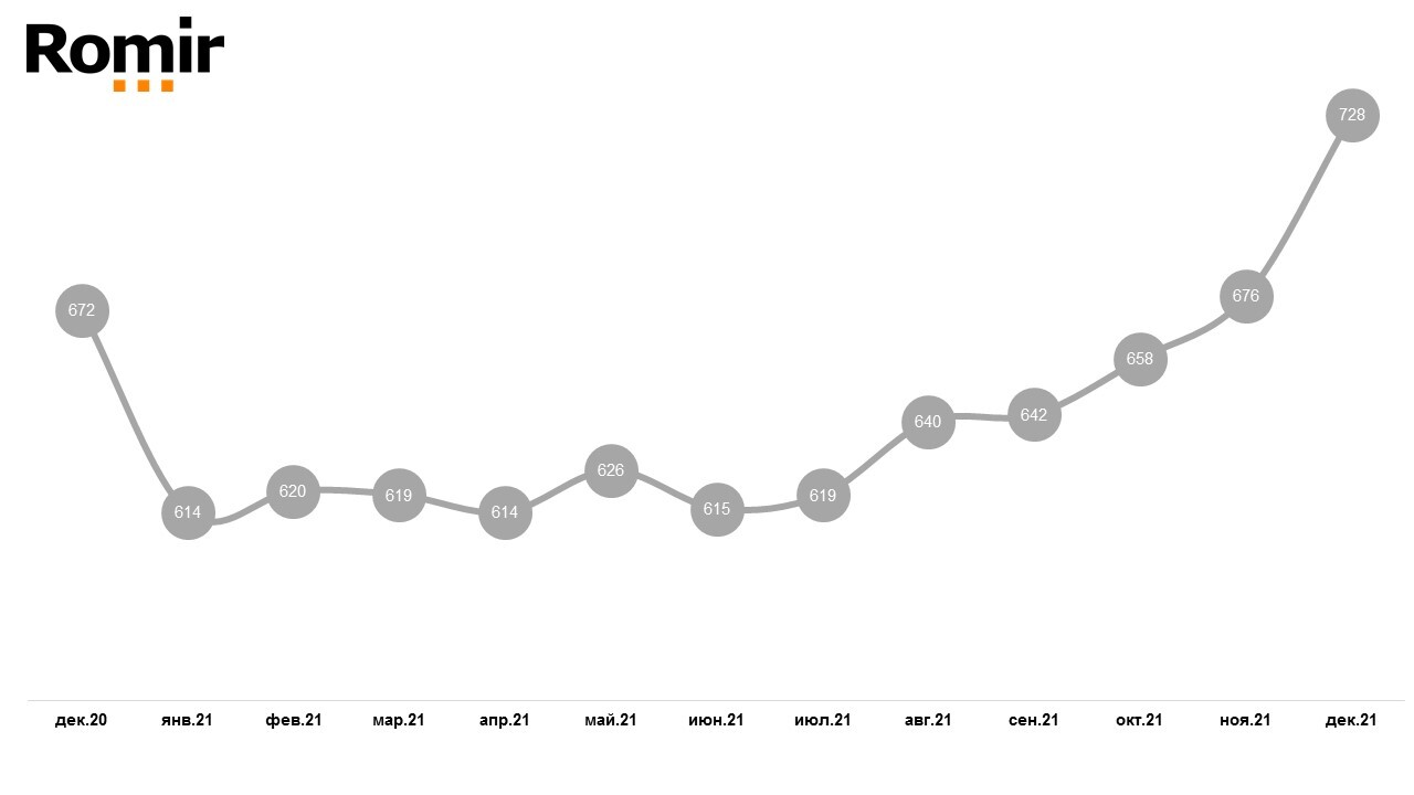Индекс среднего чека (ИСЧ) FMCG-покупок за год вырос на 8,3%, или на 56руб., говорится в исследовании«Ромир». Индекс демонстрирует динамику среднего значения покупокFMCG-товаров и общих покупок. В декабре 2021 г. показатель составил 728 руб. —на 8% (52 руб.) больше, чем в ноябре.