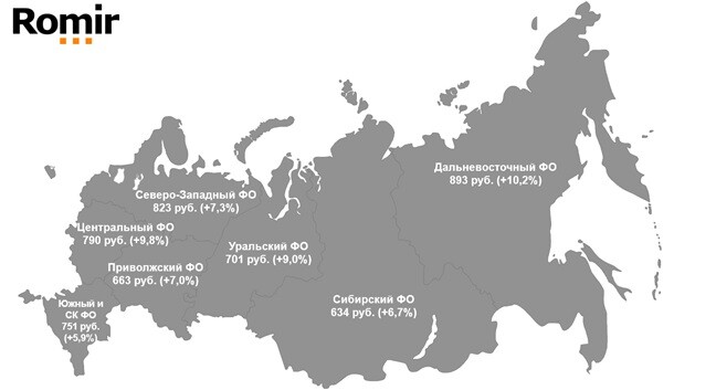 При рассмотрении изменения ИСЧ FMCG-покупок по регионам исследователиотметили наибольший рост показателя в Дальневосточном федеральном округе — на10,2%, в результате чего средний чек там составил 893 руб. Это самый высокийиндекс по стране. На втором месте — Центральный федеральный округ с ростомсреднего чека в 9,8%. Тройку лидеров по росту индекса закрывает Уральскийфедеральный округ с показателем в +9%.