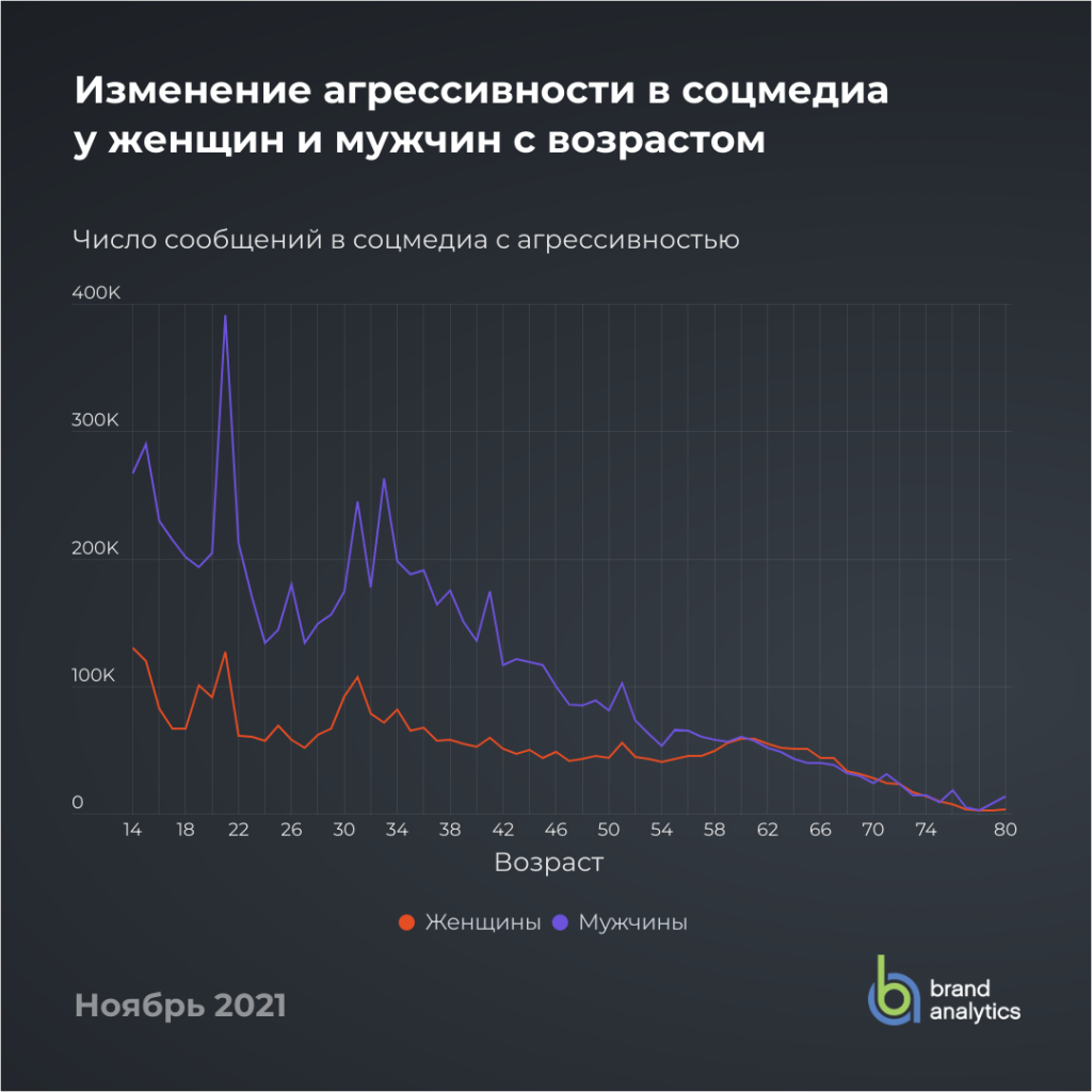 Мужчины публикуют контент с агрессивной лексикой в два раза чаще женщин — наих долю приходится 68% таких сообщений. Возрастные пики при этом приходятся на15, 21, 31–34 года. После кривая агрессивности у мужчин с увеличением возрастаплавно нисходит к минимальным значениям.