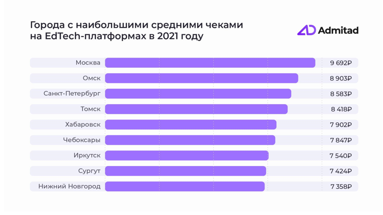 Дополнительное образование популярно в крупных городах, таких как Москва иСанкт-Петербург. В 2021 г. наибольший средний чек на EdTech-сервисах оставилижители столицы — 9692 руб. Но на второй позиции расположился менее населенныйгород — Омск с чеком в 8903 руб. Тройку лидеров закрыли жителиСанкт-Петербурга, которые в среднем тратят на онлайн-образование 8583 руб.