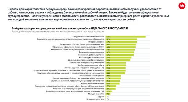 Маркетологи не заинтересованы в молодых коллективах — лишь 9% сочли ихважными при поиске работы. Об этом свидетельствуют результаты опроса платформыонлайн-рекрутинга hh.ru. Специалисты заинтересованы в высокой зарплате,интересных задачах, карьерном росте, ДМС и возможности работать удаленно.