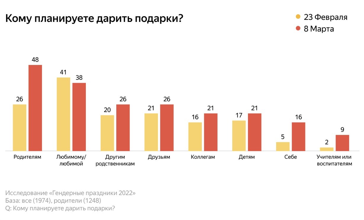 Респонденты рассказали, что в основном на гендерные праздники подарки дарятлюбимым и родителям. На 8 Марта 48% мужчин и 77% женщин собираются преподнестиподарки мамам. Также получат их и дети: каждый третий родитель порадует дочь на8 Марта, а каждый четвертый — сына на 23 Февраля. Только 29% женщин и 11%мужчин собираются купить что-нибудь себе.