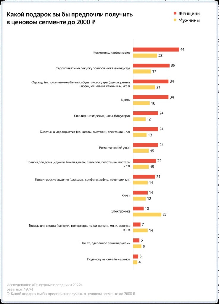 Среди подарков до 2 тыс. руб. женщины хотели бы получить косметику ипарфюмерию, а мужчины — электронику, хотя новому парфюму они тоже будут рады.Женщин также может порадовать букет цветов. Актуальным подарком для обоих половстанет предмет одежды, обувь или аксессуары. Еще респонденты рассказали, что имбыло бы приятно получить сертификаты на товары и услуги. Подписку наонлайн-сервисы в качестве подарка в основном хотят люди в возрасте от 18 до 24лет.