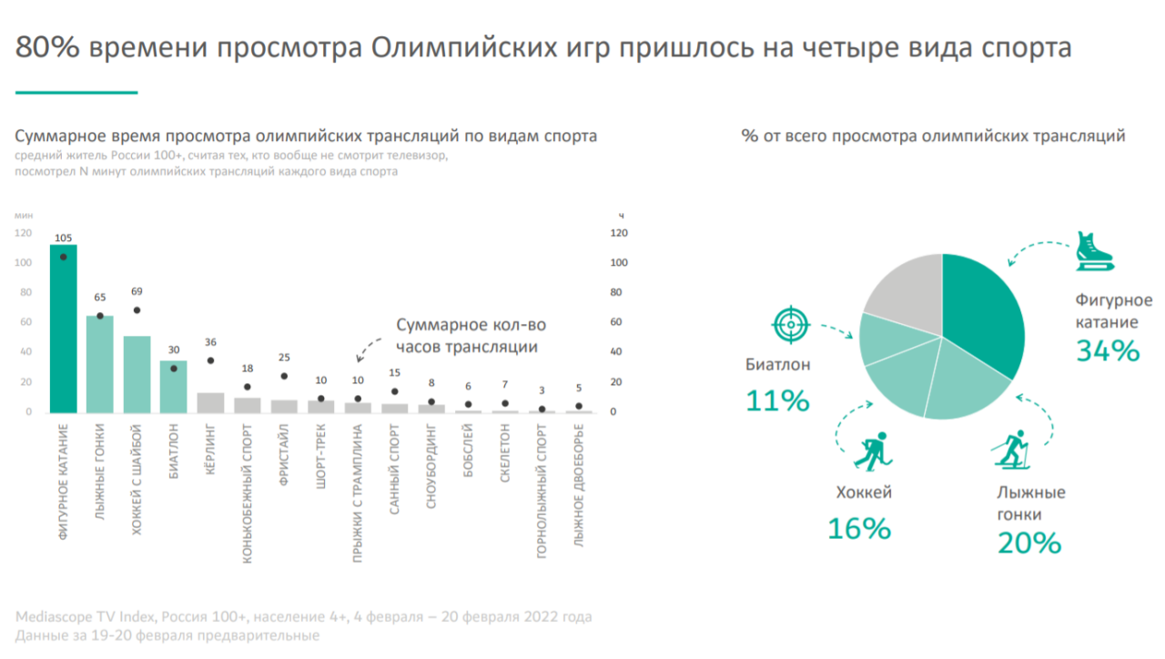 В целом 80% времени просмотра Олимпийских игр пришлось на четыре видаспорта: фигурное катание (34% от всего времени), лыжные гонки (20%), хоккей(16%) и биатлон (11%).