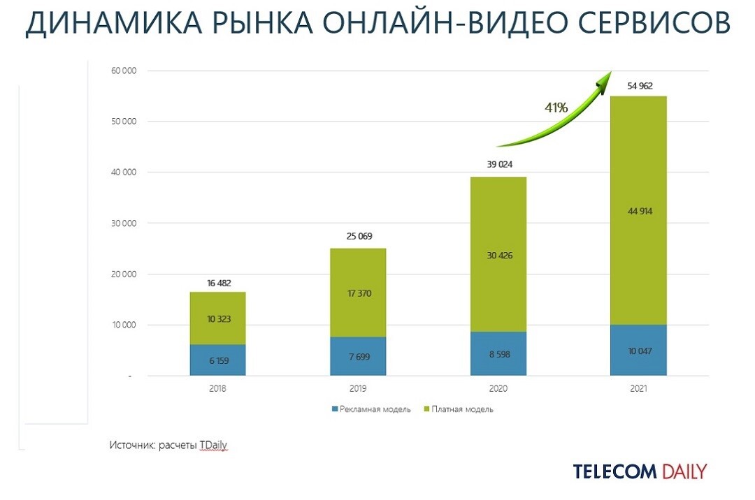 Во втором полугодии 2021 г. ОТТ-рынок ускорился: так, по итогам первогополугодия общая выручка легальных видеосервисов составила 21,9 млрд руб., а вовтором — более 33 млрд руб. В TelecomDaily подчеркнули, что в итоге рынок выросвыше прогнозов — на 41% против 25–30%, как предполагалось изначально.