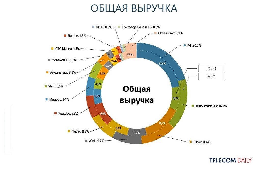 По объему выручки на ОТТ-рынке лидирует IVI, хотя за год его доля снизиласьи составила 20,5% от общей доли рынка против 22,5% в 2020 г. «Кинопоиску»удалось увеличить показатель почти вдвое — до 16,5% (в конце 2020 г. онсоставлял 9%). У Okko за тот же период доля составила 11,4%, а в 2020 г.—14,7%). Wink («Ростелеком») за год вырос с 7,3 до 9,7%. Netflix продолжилнаращивать выручку, хотя, по данным аналитиков, делал это медленнее, чем впредыдущие периоды. Его показатель в прошедшем году составил 9%, а в 2020 г. —8,3%). YouTube и Megogo также снизили показатели — 7,3 и 6,1%, соответственно(в 2020 г. — 9 и 5,9%).