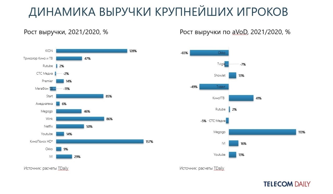 В денежном выражении максимальный рост показал «Кинопоиск», увеличив выручкуна 157%. На втором месте — принадлежащий МТС Kion с ростом в 128% (при этом егодоля в общей выручке — 0,8%). Замыкает тройку лидеров Wink (86%), далее идетStart (85%), Netflix (50%) и «Триколор Кино и ТВ» (47%).