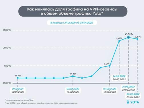 В общем объеме трафика Yota доля VPN-сервисов также начала расти с 21февраля. На пике — с 21 по 27 марта — доля трафика на VPN-приложенияувеличилась в 9 раз и составила 2,6% от общего. В последнюю неделю мартаабоненты потратили в 69 раз больше трафика на VPN-сервисы, чем в первую неделюянваря.