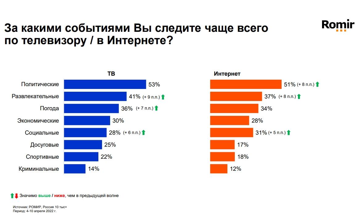 Среди россиян заметно вырос интерес к развлекательным и социальным событиям,за которыми они следят в интернете и на телевидении, в период с 4 по 10 апреля.Об этом говорится в исследовании «Ромир». Одновременно с этим в интернетероссияне также стали чаще следить за новостями, отмечают эксперты.