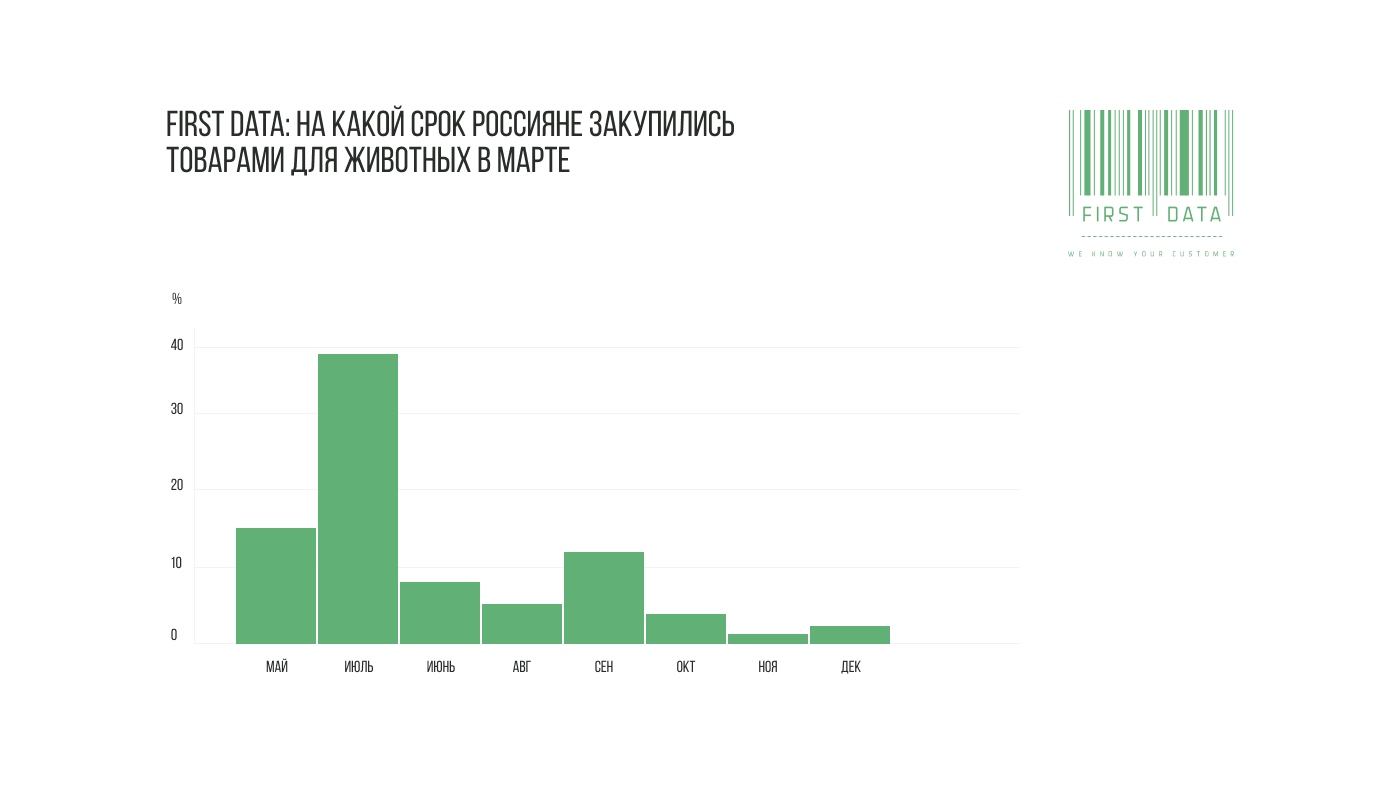 Сравнив примерное потребление зоотоваров в обычный период c объемами закупокв марте, аналитики First Data спрогнозировали возвращение спроса на такиетовары в ближайшее время.Так, больше всего запасливых владельцев животных (38%) закупили кормов на 2-3месяца вперед и вернутся за покупками в июне. В мае предположительно запасызакончатся у 11% закупившихся впрок, а у 14% еды для питомцев должно хватить досентября.