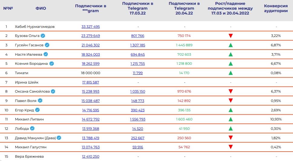 В агентстве отметили и большое количество отписок от блогеров в Telegram.Например, у Ольги Бузовой и Валерии Чекалиной каждый час отписывается около 50человек. В месяц средний отток подписчиков у этих инфлюенсеров составляет около50 тыс. пользователей. «В некоторых аккаунтах отписки и подписки в течение дняизмеряются тысячами. В сравнении с мартовскими данными у 30 звезд количествоподписчиков сократилось. Отписки достигают 10%», — отмечают в компании.