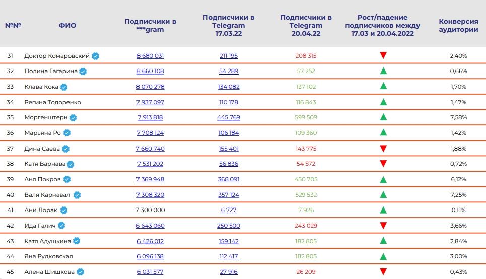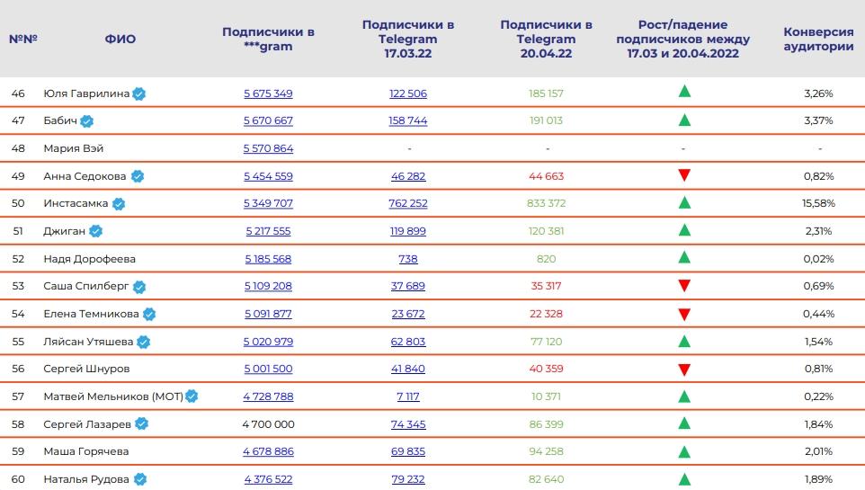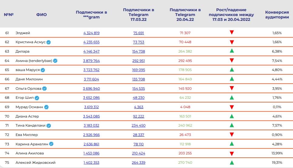 Трансфер под подписчиков звездных блогеров из Instagram* в Telegram неудался. Об этом говорится в исследовании агентства PR-Consulta. У топ-75лидеров мнений в Instagram* средний процент миграции аудитории составил менее4% и у шести аккаунтов превысил 10%.