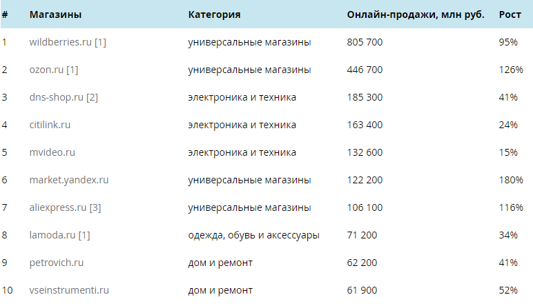 Первое место в рейтинге удержал маркетплейс Wildberries, продажи котороговыросли год к году почти вдвое – до 805,7 млрд руб. за ним идет Ozon,нарастивший продажи в 2,3 раза – до 446,7 млрд руб. Сместившийся с третьего начетвертое место «Ситилинк» увеличил продажи на 24%, до 163,4 млрд руб.