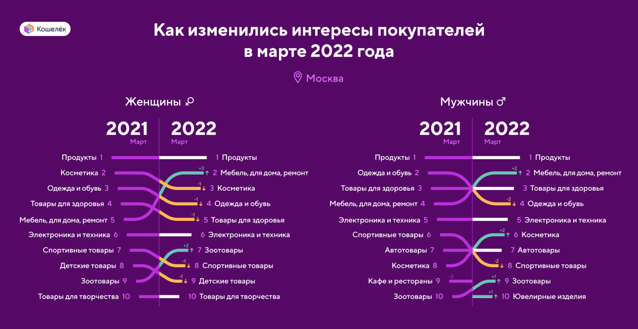 Жительницы Москвы продолжали совершать покупки в категории«Косметика» — эта категория заняла третье место после продуктовыхмагазинов и товаров для дома. Магазины одежды и обуви сдвинулись в рейтинге начетвертое место: женщины предпочитают купить больше косметики и средств дляухода за кожей, а не обновить гардероб. Кроме того, в этом году женщины вМоскве чаще чем мужчины выбирали товары для животных — эта категорияоказалась выше: на седьмом и девятом месте соответственно. Магазины категории«Товары для здоровья» неизменно удерживают позицию на третьем месте умужчин из Москвы.