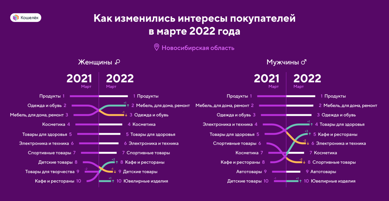 Стабильность характерна и для мужчин из Новосибирской области, правда, у нихна третьем месте магазины одежды и обуви. И только в этом регионе категория«Кафе и рестораны» поднялась на 3 позиции вверх по сравнению с прошлымгодом и вошла в пятерку рейтинга.