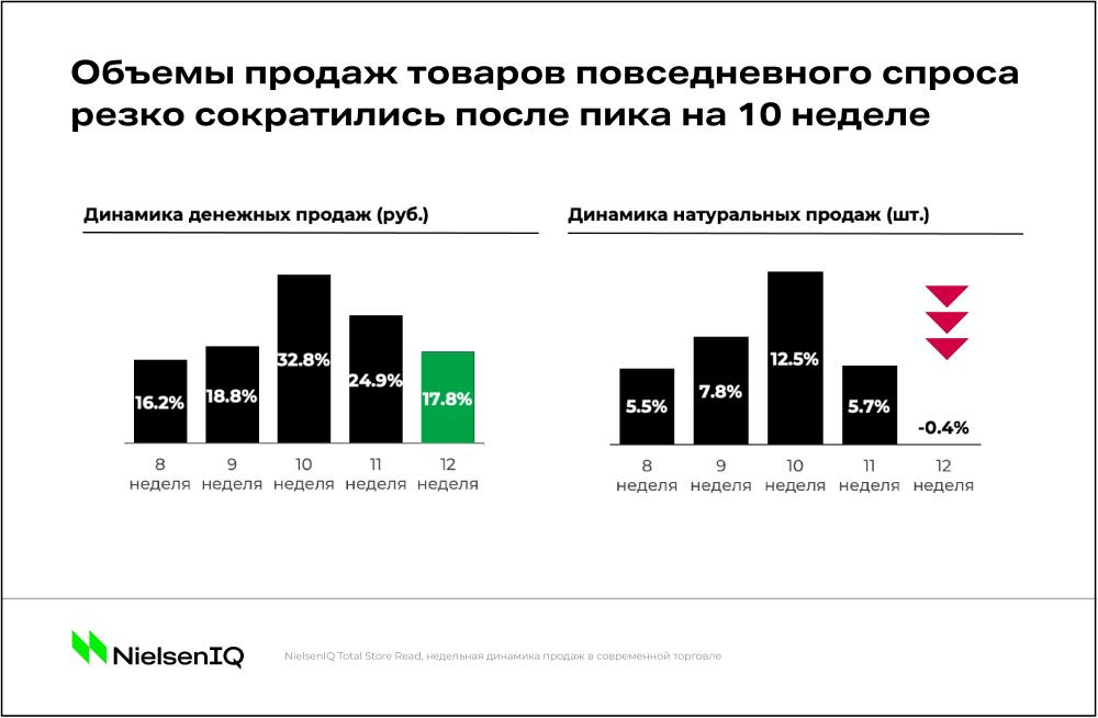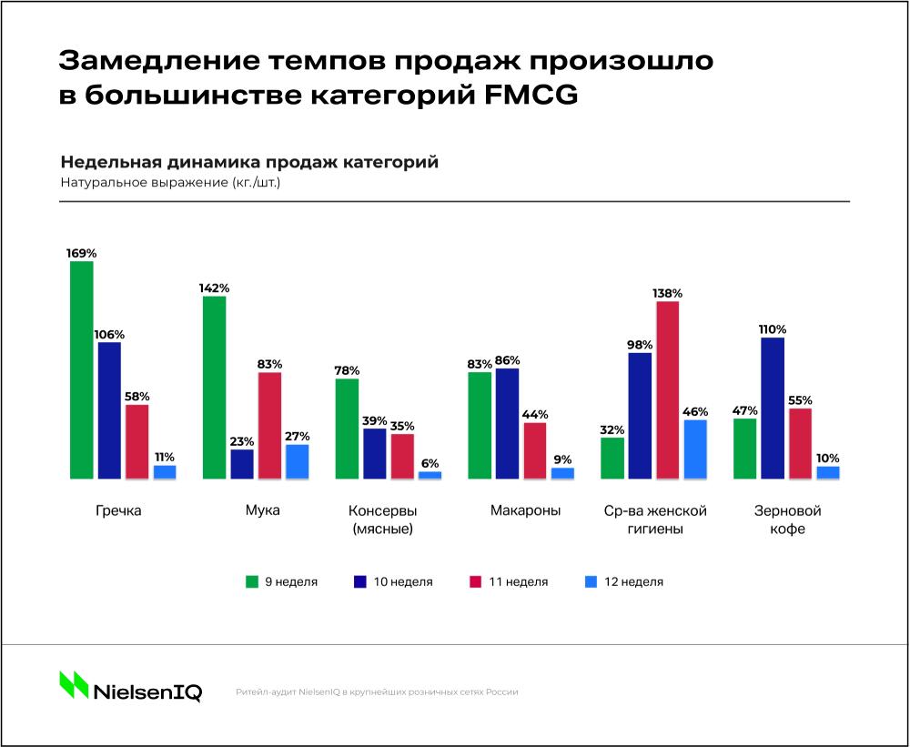 «Период ажиотажного спроса, который длился на протяжениипоследних недель, завершился, и теперь рынок FMCG переживает стагнациюнатуральных продаж, которая с высокой долей вероятности сильнее уйдет вотрицательную зону в течение апреля. Сопоставимые продажи (like-4-like,без учета открытия новых магазинов) уже демонстрируют резкое снижение во всехканалах современной торговли за исключением минимаркетов. Тем не менее, даже вних динамика существенно ниже докризисных значений. На 12 неделе (21–27 марта)динамика сопоставимых продаж в натуральном выражении составила -5% по сравнениюс годом ранее», — констатирует директор по работе с ритейлом «NielsenIQРоссия» Константин Локтев.
