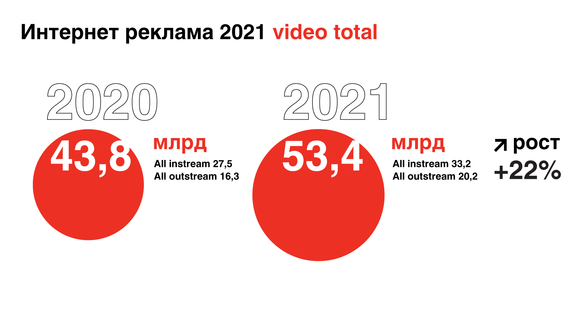 Объем performance video увеличился на 26% — до 21,1 млрд руб. На подсегментin-stream потратили 11,3 млрд руб, что выше показателя 2020 г. на 28%. Объемout-stream приблизился к отметке 9,8 млрд руб., показав рост на 23%.