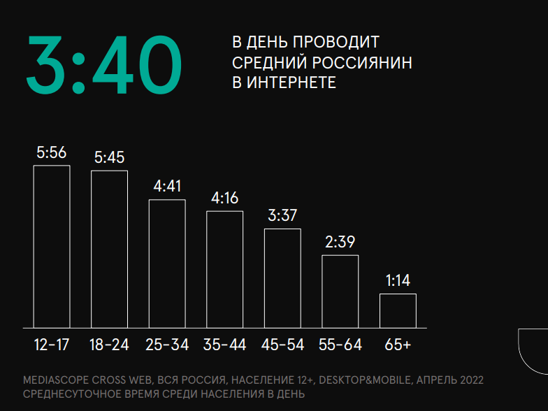 Среднее время, которое россияне старше 12 лет проводят в интернете,составило 3:40 минут в апреле 2022 г., согласно данным Mediascope,представленным на конференции Digital Brand Day 2022. Больше всего времени всети проводят пользователи 12–17 лет (5:56) и 18:24 лет (5:45).