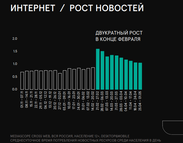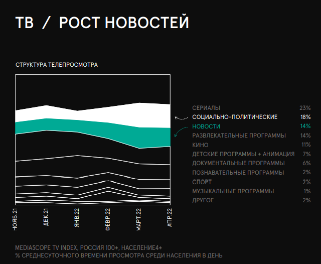 В первые недели после начала конфликта России с Украиной среднесуточноепотребление новостных интернет-ресурсов выросло вдвое, затем последовалонекоторое снижение, но в апреле время потребления новостных ресурсов оставалосьвыше значений начала года. На телевидении россияне так же начали чащеинтересоваться новостями, на которые в апреле 2022 г. приходится 14%телесмотрения, еще 18% занимают социально-политические программы.