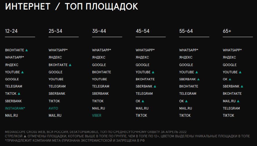 Первым по росту среднесуточного охвата среди мессенджеров в марте-апрелестал Telegram среди соцсетей – «ВКонтакте»: на эти площадки перераспределиласьаудитория запрещенных и признанных экстремистскими Instagram и Facebook.Месячный охват YouTube в феврале снизился с 89,5 до 88,8 млн человек, однако вапреле вырос к началу года до 89,5 млн человек. Аналогичный показатель Rutube вапреле 2022 г. достиг 16,4 млн человек. В начале года месячный охват сервисабыл 6,4 млн человек.