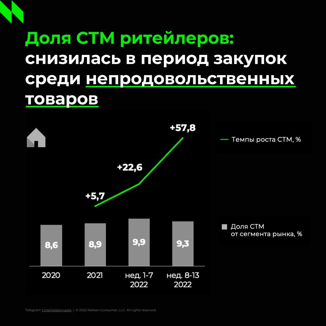 В категории непродовольственных товаров темы роста СТМ достигли 57,8% вгодовом выражении с 8 по 13 неделю (с 21 февраля по 3 апреля). Вместе с тем ихдоля от общего рынка снизилась — с 9,9% до 9,3%. Это связано с тем, что вуказанный период темпы роста брендированных товаров были выше, объясняют вNielsen.