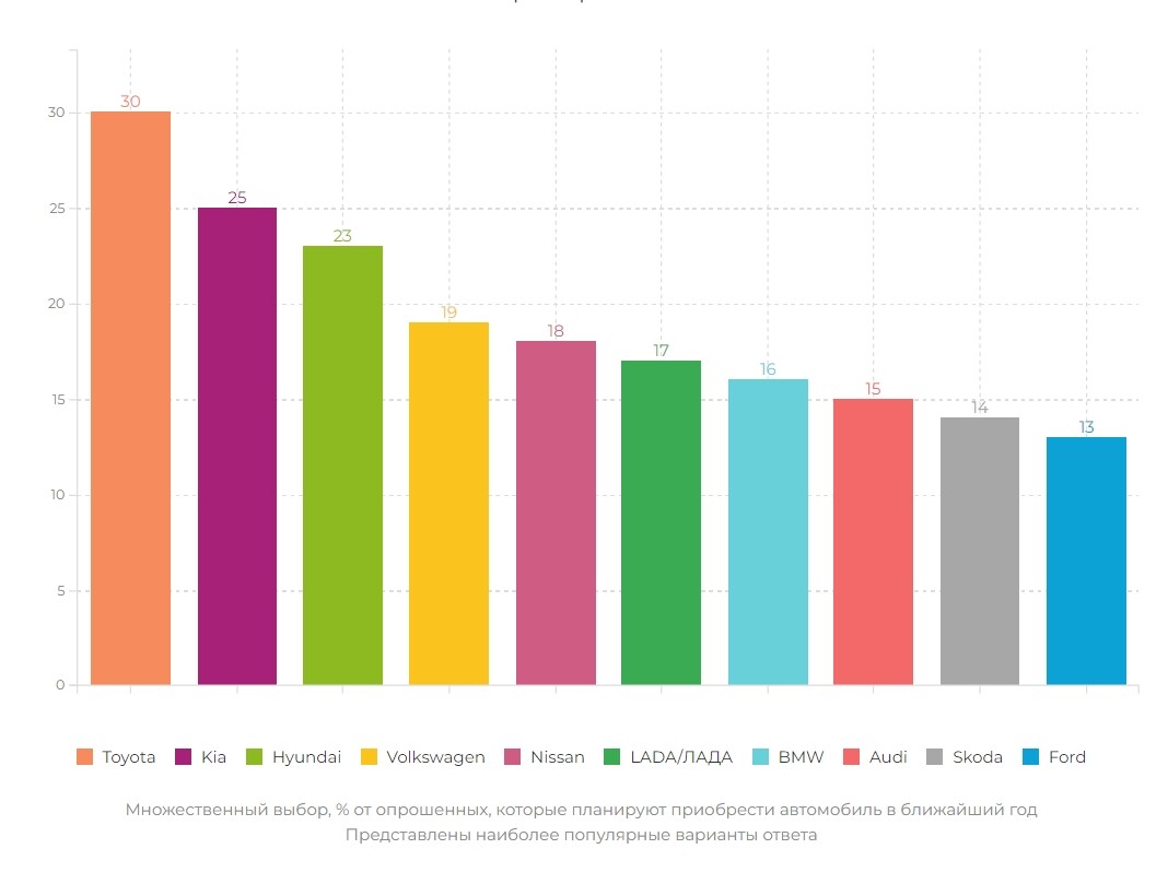 Приоритетность брендов изменилась, когда респонденты отвечали на вопрос:«Если исключить независящие от вас обстоятельства: рост цен на автомобили,отсутствие поставок необходимых деталей для техобслуживания и т. п., тоавтомобили каких марок вы хотели бы приобрести?». В этом случае на первое местовыходит Toyota с 30% голосов. Далее идут KIA (25%) и Huyndai (23%). Ladaсмещается на шестое место с 17% голосов.