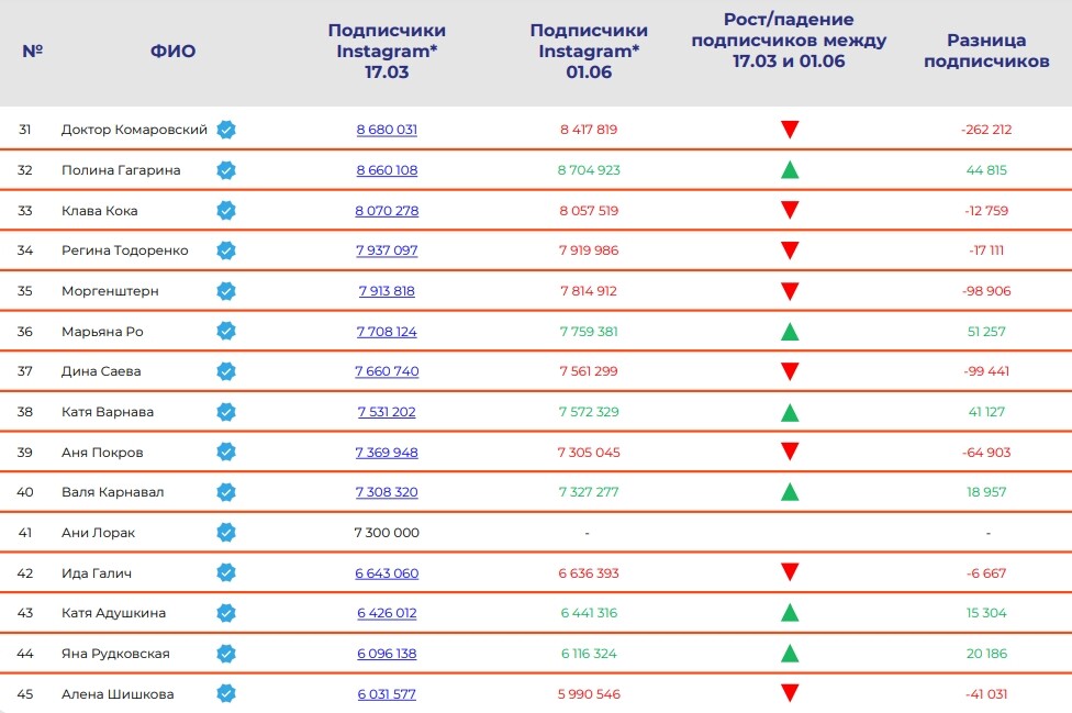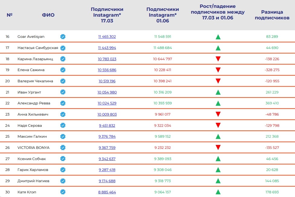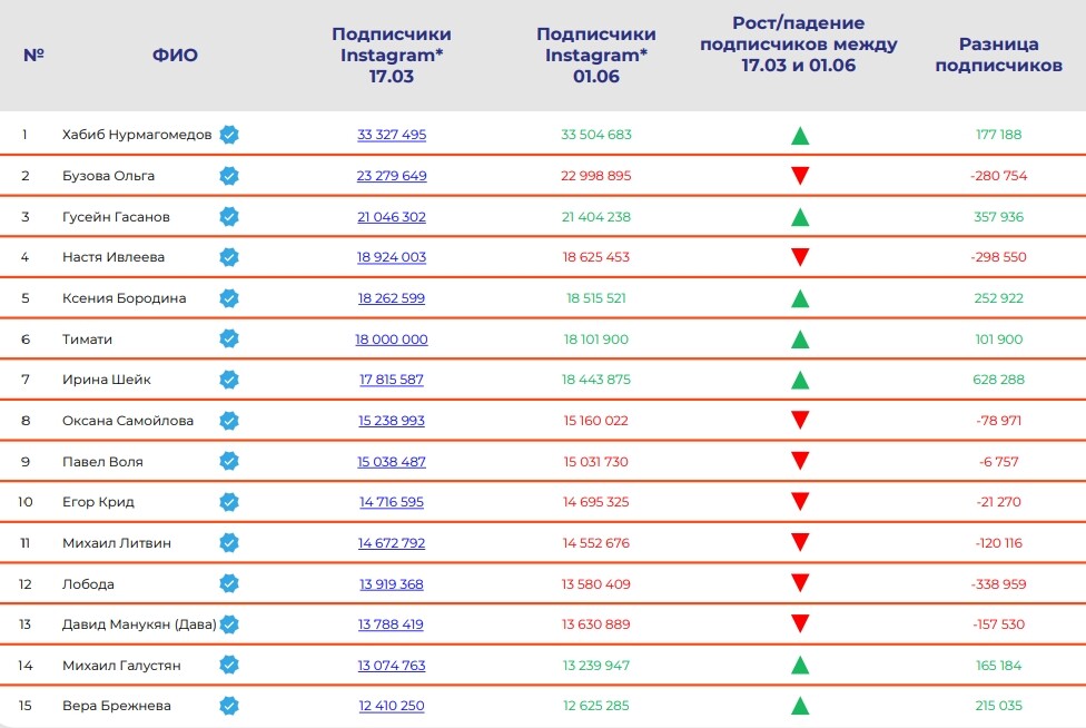 В целом 92% звезд из анализируемого списка постят контент. При этомаудиторию с середины марта по июнь значительно нарастили: Ирина Шейк (+628922), Александр Ревва (+369 410), Гусейн Гасанов (+357 936), Иван Ургант (+261229), Ксения Бородина (+252 922). Падение подписчиков наиболее заметно уЛободы (-338 959), Елены Сажиной (-338 959), Насти Ивлеевой (-298 550), ОльгиБузовой(-280 754) и Давида Манукяна (Дава) (-157 530).