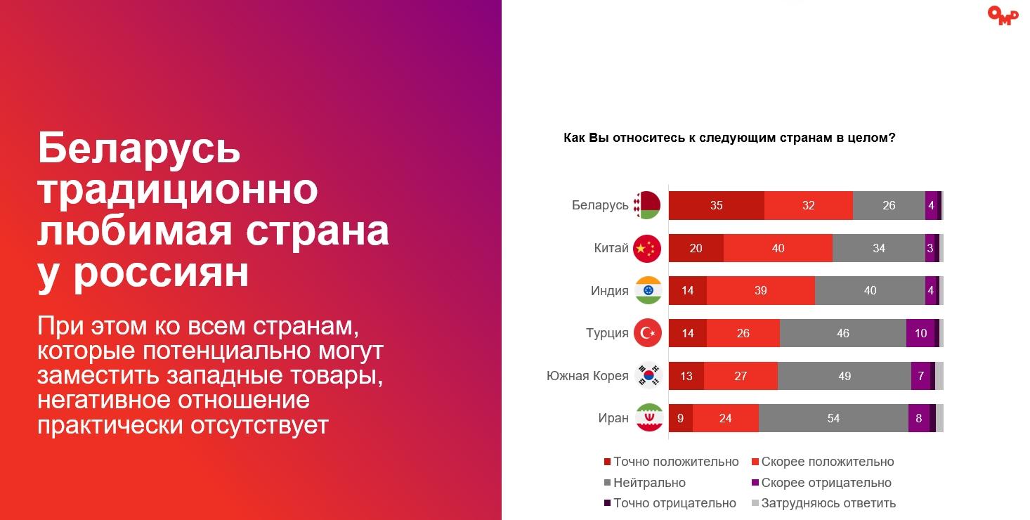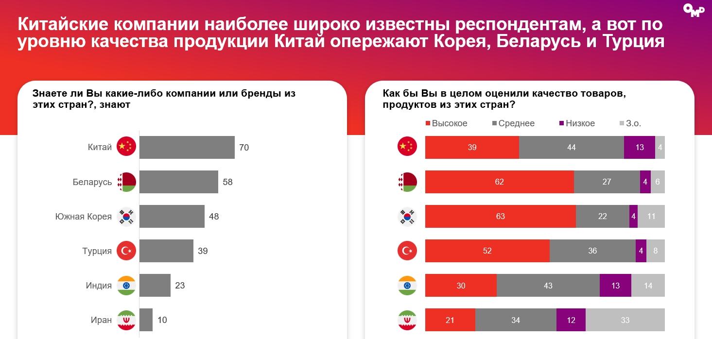 Ко всем странам, которые потенциально могут заместить западные товары,негативное отношение практически отсутствует. Позитивнее всего опрошенныеотносятся к Беларуси и Китаю. Наиболее широко известны респондентам китайскиекомпании, но по уровню качества их обходят производители из Кореи, Беларуси иТурции.