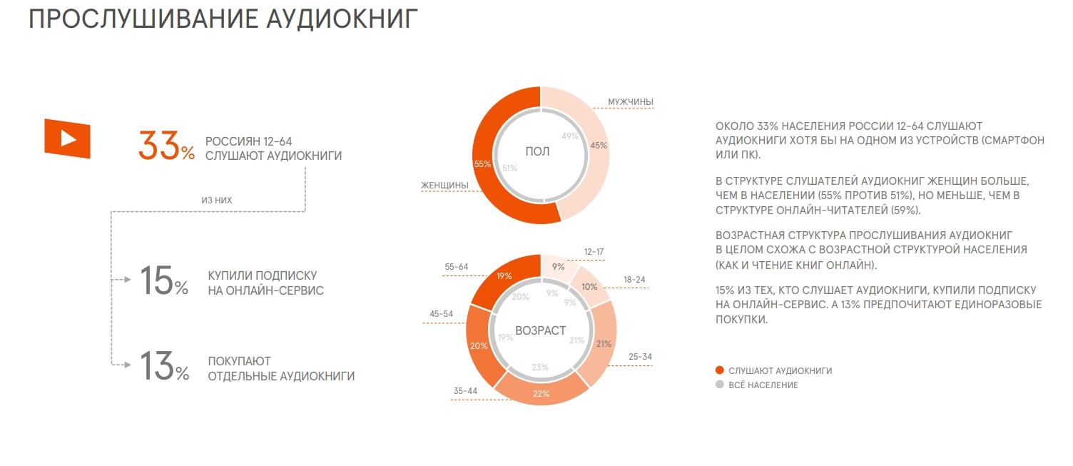 Порядка трети россиян в возрасте 12-64 слушают аудиокниги. Из них 15% купилиподписку на онлайн-сервис для прослушивания книг, а 13% покупают отдельныеаудиокниги.