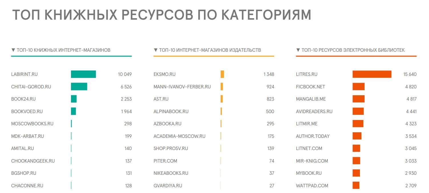 Крупнейшим ресурсом среди книжных интернет-магазинов стал «Лабиринт», средионлайн-магазинов издательств первым оказался сайт «Эксмо», а среди электронныхбиблиотек – «Литрес».