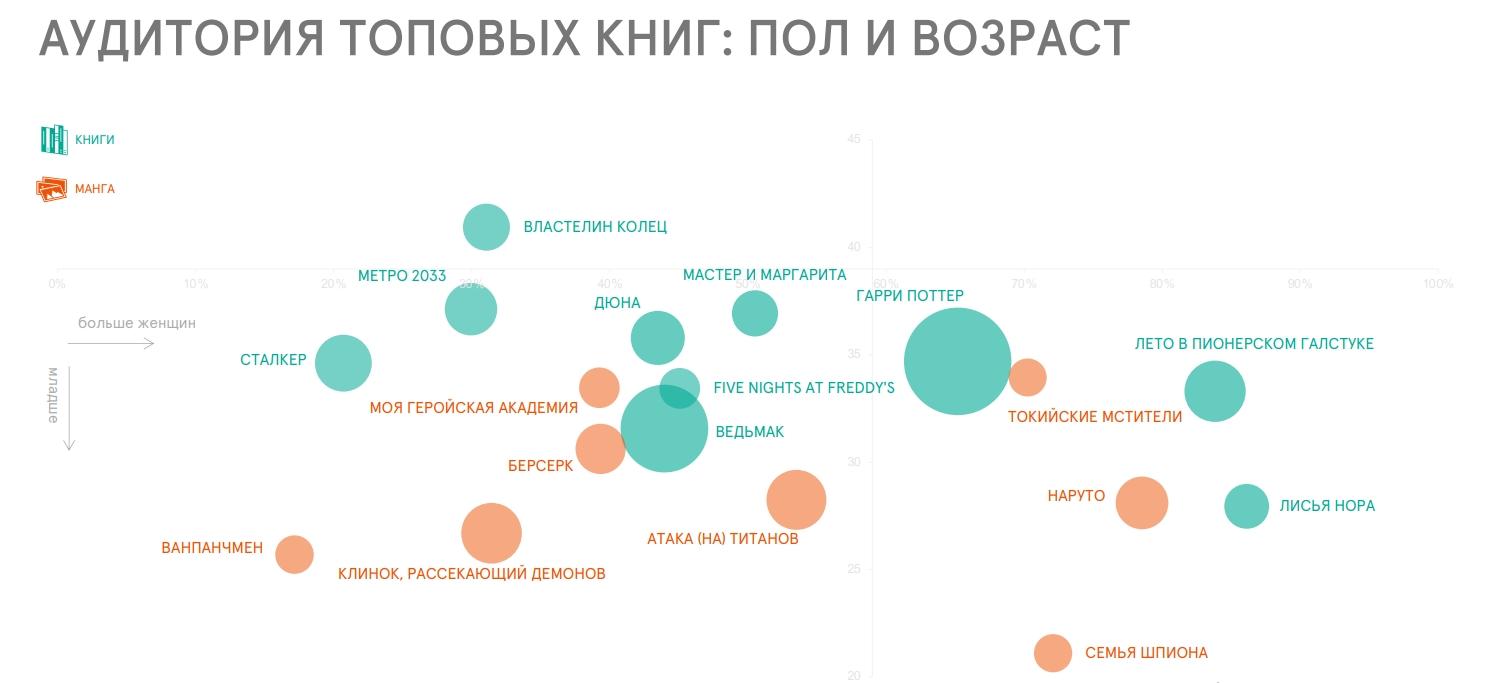 Поиск книг в интернете принципиально отличается среди мужчин и женщин.Женщины чаще ищут детские книги и произведения по психологии, а также вносятсущественный вклад в популярность книг в жанре «young adult». Среди мужскойаудитории в топе поисковых запросов находится больше книг, на основе которыхбыли созданы видеоигры или, наоборот, книг, которые были изданы в качествепродолжения сюжета компьютерных игр.