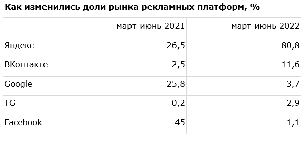 Популярность «ВКонтакте» и Telegram аналитики связали с падением бюджетов наплощадках компании Meta (признана экстремистской и запрещена на территорииРоссии) и Google. В марте-июне объем платежей на этих платформах сократился вгодовом выражении на 99% и 96% соответственно.