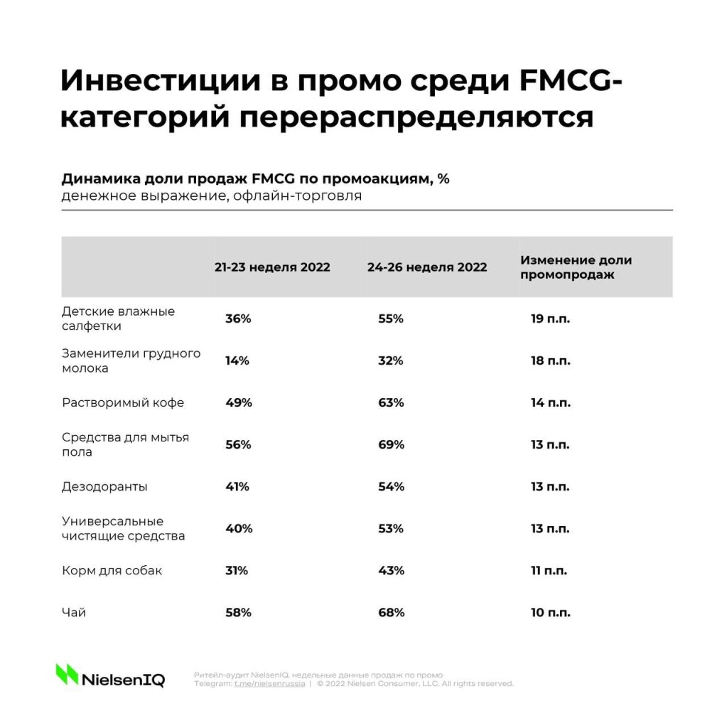 Самый заметный прирост доли в промо июне и июле был зафиксирован в продажахвлажных салфеток для детей и заменителей грудного молока (на 19% и 18%соответственно). Доля продаж растворимого кофе со скидками выросла на 14%.Также существенный рост промо показали категории дезодорантов и чистящихсредств — на 13% в каждом случае, туалетного мыла — на 12%. Крупныепроизводители поясняют изданию, что возврат к промо был необходимым, так как онпомог повысить спрос в отдельных категориях товаров.