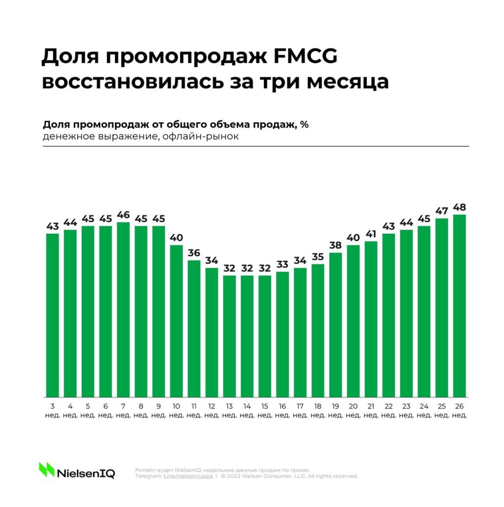 Доля продаж FMCG со сидками в денежном выражении достигла 48% к началу июля,пишет «Ъ»со ссылкой на исследование NielsenIQ. Это новый недельный максимум для 2022года, так как в начале года доля промо только сокращалась. Уровень промо нароссийском рынке восстановился после рекордного спада за три месяца, резюмируютаналитики.