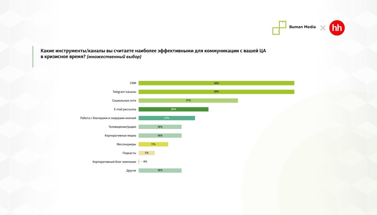 Среди наиболее эффективных каналов коммуникации лидируют СМИ иTelegram-каналы (по 58% каждый), хотя годом ранее работа со СМИ занимала толькотретье место. Далее расположились социальные сети (37%), e-mail-рассылки (26%)и работа с блогерами и лидерами мнений (21%). При этом соцсети и лидеры мненийлидировали по эффективности в прошлом году. Радио и телевидение считаютнаиболее эффективными 16% опрошенных, такая же доля респондентов высказалась впользу корпоративных медиа. Наименее продуктивными признаны подкасты (5%).