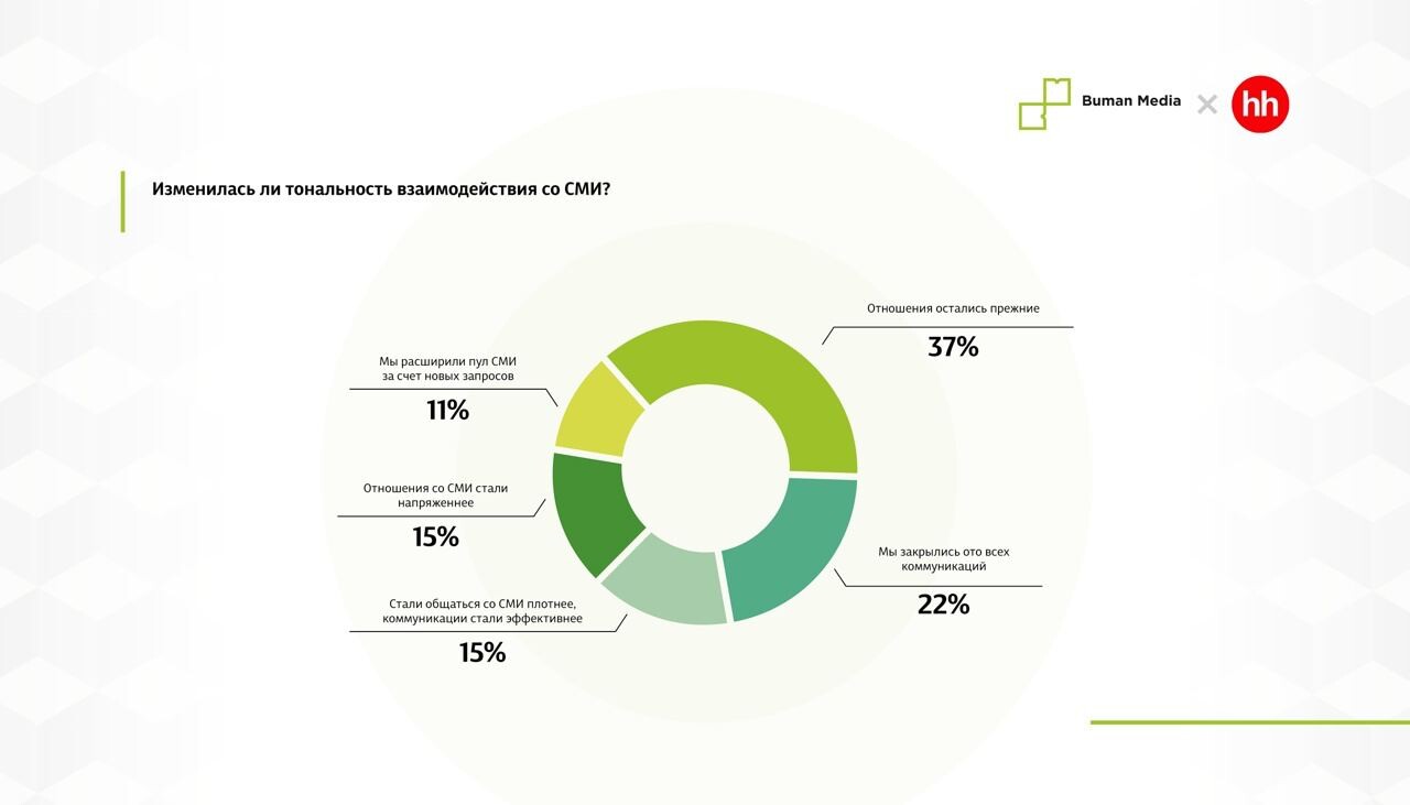 Выросли расходы на PR только у 11% опрошенных. Часть компаний, увеличившихбюджет, направили его на оплату услуг внешнего PR-агентства или консультанта,оставшиеся направили перераспределенные средства на составление мониторингов ианалитики, а также на внутренние коммуникации (по 5% каждый). Руководителиотмечали и другие направления: новые медиа, а также проектную деятельность,включая офлайн-проекты.