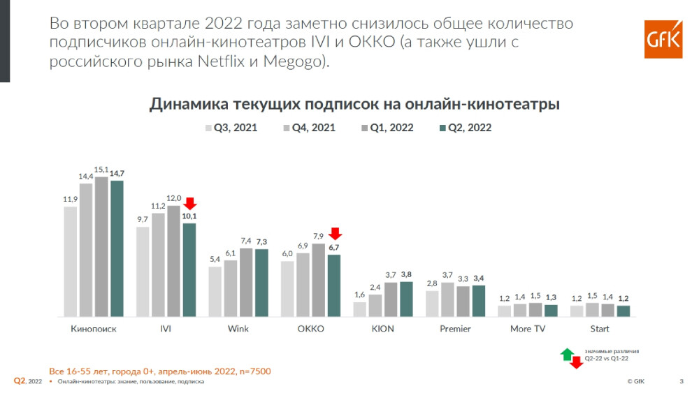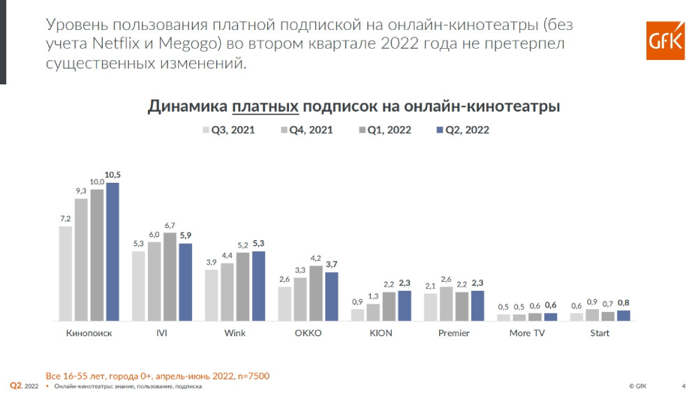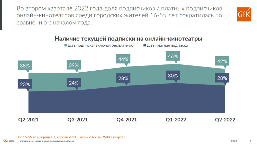 На снижении общего количества подписок аналитики Gfk называют «небольшим».На отрицательной динамике сказались уход с российского рынка Netflix, Megogo,также свое влияние могли оказаться переключение большой доли горожан сразвлекательного контента на информационный, уменьшение нового контента вонлайн-кинотеатрах, сокращение их маркетинговой активности. «При этом числожителей городов, которые платят за подписку, по сравнению с началом годаизменилось минимально», — заключают эксперты.