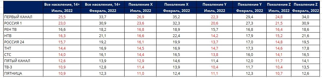 Заметнее всего показатели просели лидеров рейтинга по общему среднедневномуохвату — у Первого канала (-8,1. п.п. к февралю) и «Россия 1» (-8 п.п.). Натретьем месте по сокращению охвата оказался НТВ, в общем рейтинге телеканалтакже сместился с третьей на четвертую строчку, уступив место РЕН ТВ.
