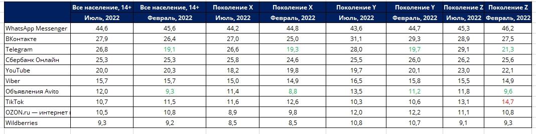 Среднесуточный охват среди приложений изменился незначительно. Напервом месте остался WhatsApp с охватом 44,6%, на втором – «ВКонтакте» (27,9%).Вырос с 19,1% до 26,8% охват Telegram, что привело его на третье место средиприложений после пятого в феврале. Полгода назад на третьем месте был «СбербанкОнлайн», а на четвертом YouTube.
