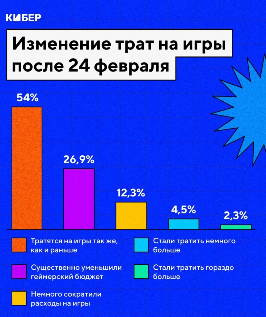 Расходы на игры с началом российско-украинского конфликта существенносократили 26,9% российских геймеров. Об этом говорится в результатахопроса издания «Кибер». Еще 12,3% немного сократили этустатью расходов. При этом больше половины (54%) сообщили, что тратятся на игрытак же, как и раньше.